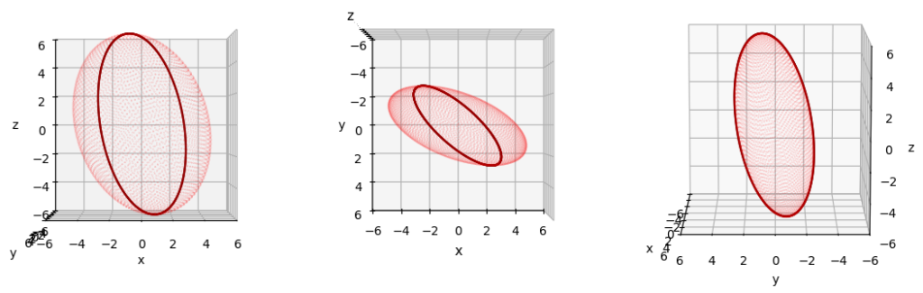 To get to the aspired proofs, we will first look at some geometrical aspects of the projections of multidimensional ellipsoids. One such aspect is related to the question how we can describe, identify and create those special points on the original ellipsoidal surface which determine the border of the orthogonal projection of the ellipsoid. Readers of this blog know already that an ellipsoid can be created by a applying a linear transformation to vectors of a (n-1)-dimensional unit sphere. I.e., we want to identify points on the unit sphere which get transformed by a (n x n)-matrix A to image points on the ellipsoid whose tangential spaces control the projection. At the end of this post, we will use the result to explicitly identify such points by a numerical algorithm for ellipsoids in the ℝ3 below.
