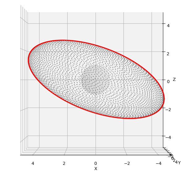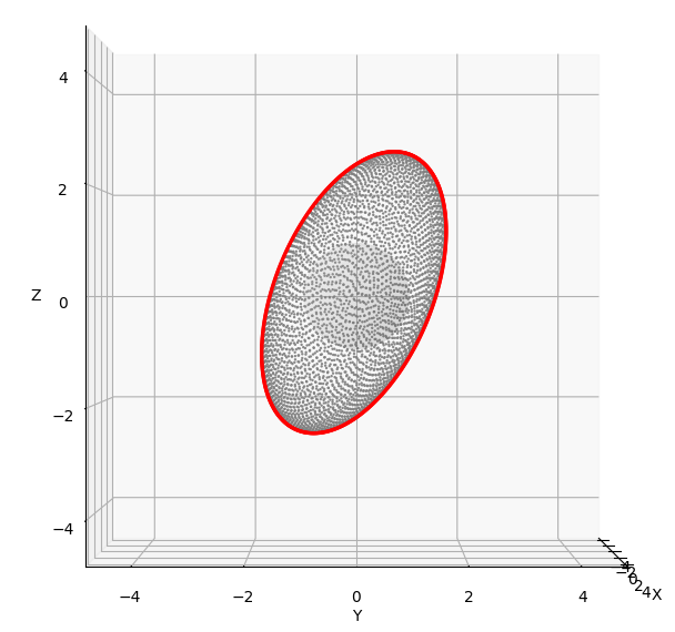 Now, if everything is correct, we should exactly see the points after a transformation with A at the border of the ellipsoid when we look at the ellipsoid along the x-axis (azimuth=90; elevation=0). This is actually the case.