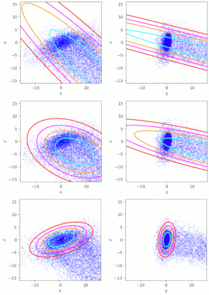 In other posts in this blog (see [1] to [3]), I have discussed multiple methods to calculate and construct confidence ellipses of “Bivariate Normal Distributions” [BVNs]. BVNs are the marginal distributions of “Multivariate Normal Distributions” [MVNs] in e.g. n dimensions ( n > 2). Therefore, two-dimensional confidence ellipses appear as projections of n-dimensional concentric confidence ellipsoids of MVNs onto (2-dim) coordinate planes. The properties of the confidence ellipsoids, which also give us contours of the probability density, are defined by the variance-covariance matrix Σ of the MVN. This post discusses a method to compute the confidence ellipsoids and ellipses for an inner MVN-like core of an otherwise largely asymmetric distribution, which in its overall shape and structure deviates strongly from a MVN.